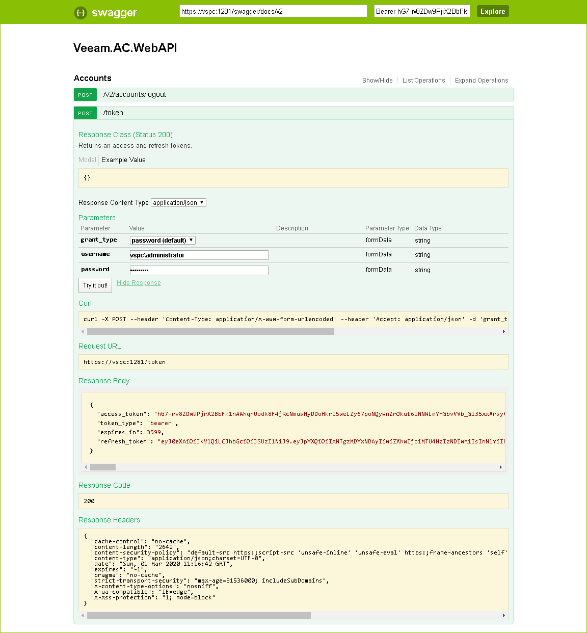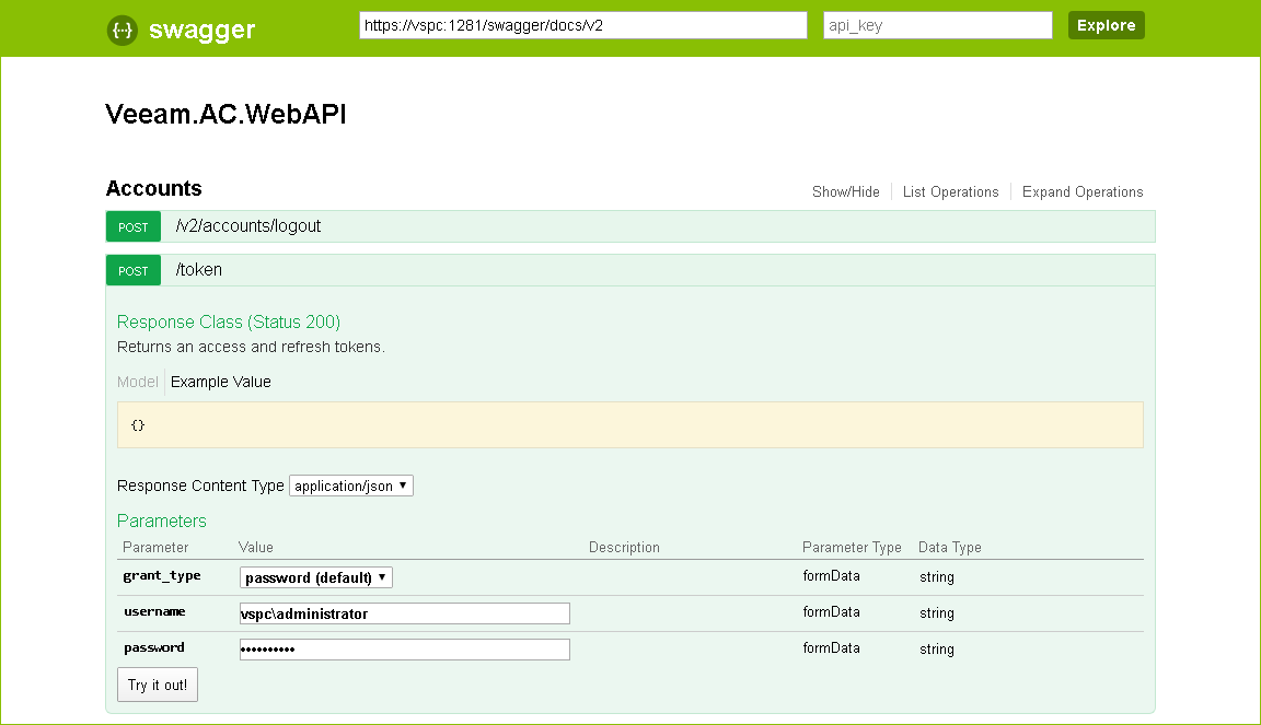 - On the Veeam.AC.WebAPI page, expand the Accounts resource and click POST /token.