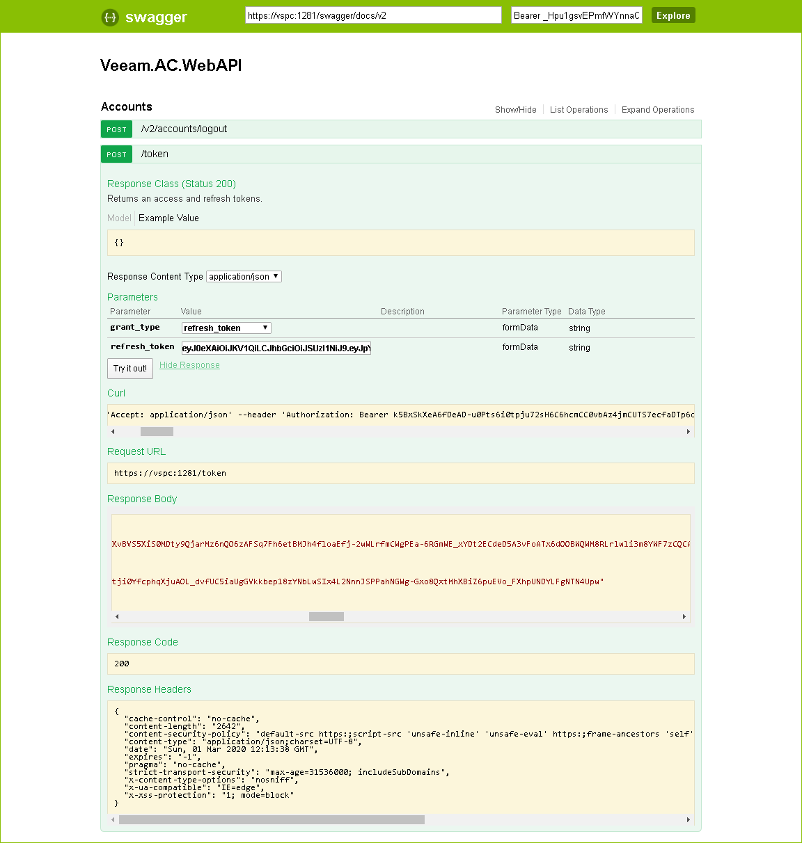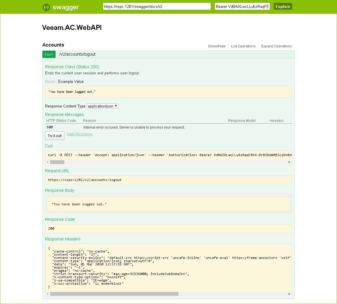 - On the Veeam.AC.WebAPI page, expand the Accounts resource and click POST /accounts/logout.