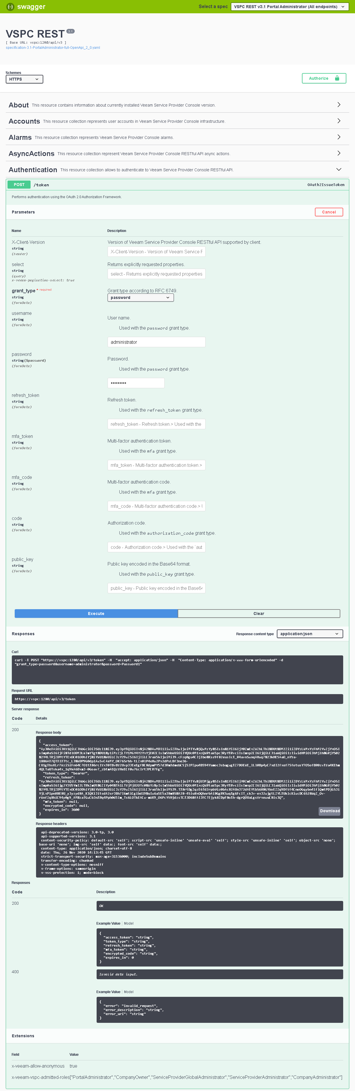 - On the VSPC REST 3.0 page, expand the Authentication resource and click POST /token.