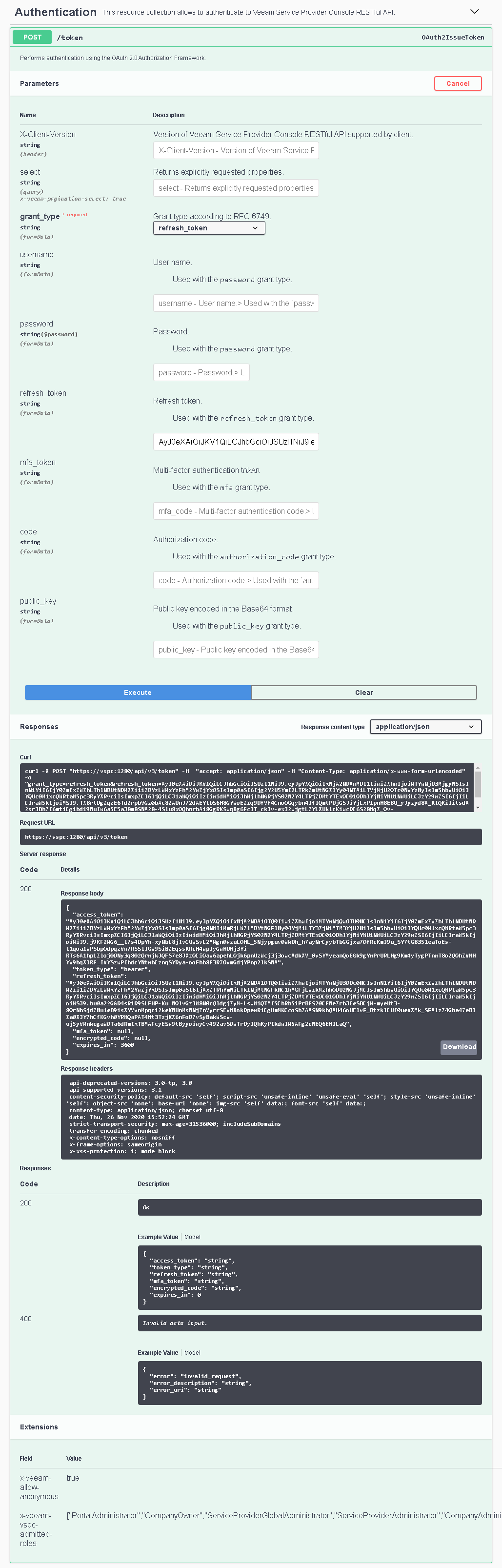 - On the VSPC REST page, expand the Authentication resource and click POST /token.
