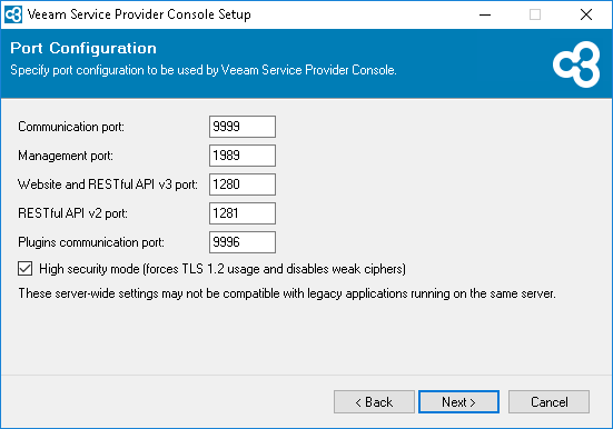 The High security mode option disables using weak ciphers for all communications with the machine on which Veeam Service Provider Console Web UI component runs. This may interfere with the operation of 3rd party software installed on the same machine. |