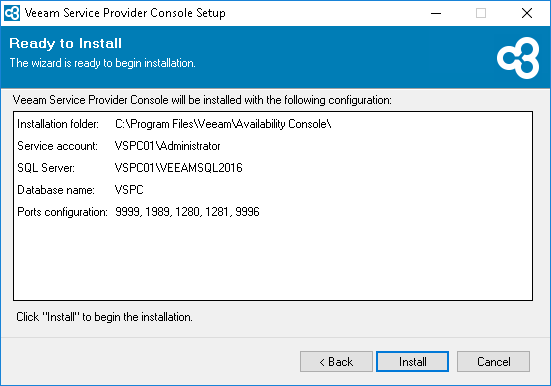 - At the Ready to Install step of the wizard, review the provided configuration settings and click Install.