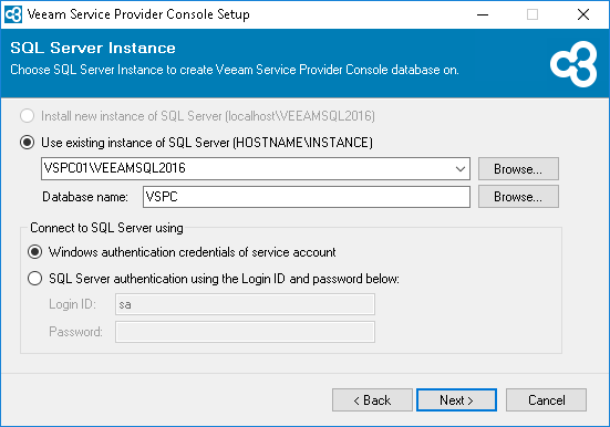 If this option is selected, the setup will install Microsoft SQL Server Express locally, on the machine where you are installing Veeam Service Provider Console, and will create a database with the default name VSPC.