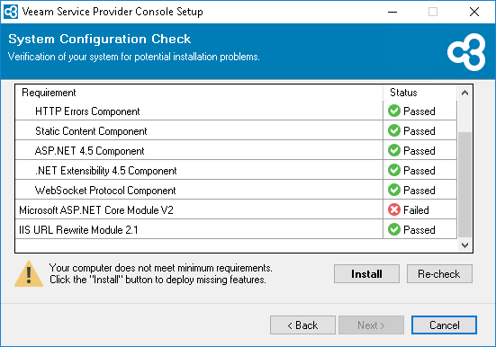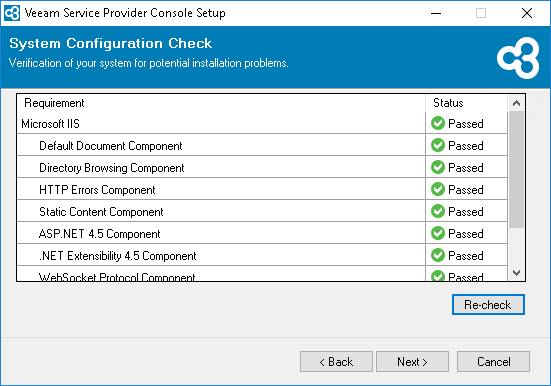Before proceeding with the installation, the installer will perform system configuration check to determine if all prerequisite software is available on the machine. To learn what software is required for Veeam Service Provider Console, see System Requirements.