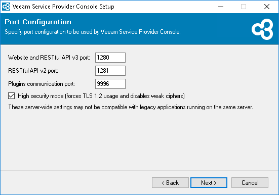 The High security mode option disables using weak ciphers for all communications with the machine on which Veeam Service Provider Console Web UI component runs. This may interfere with the operation of 3rd party software installed on the same machine. |