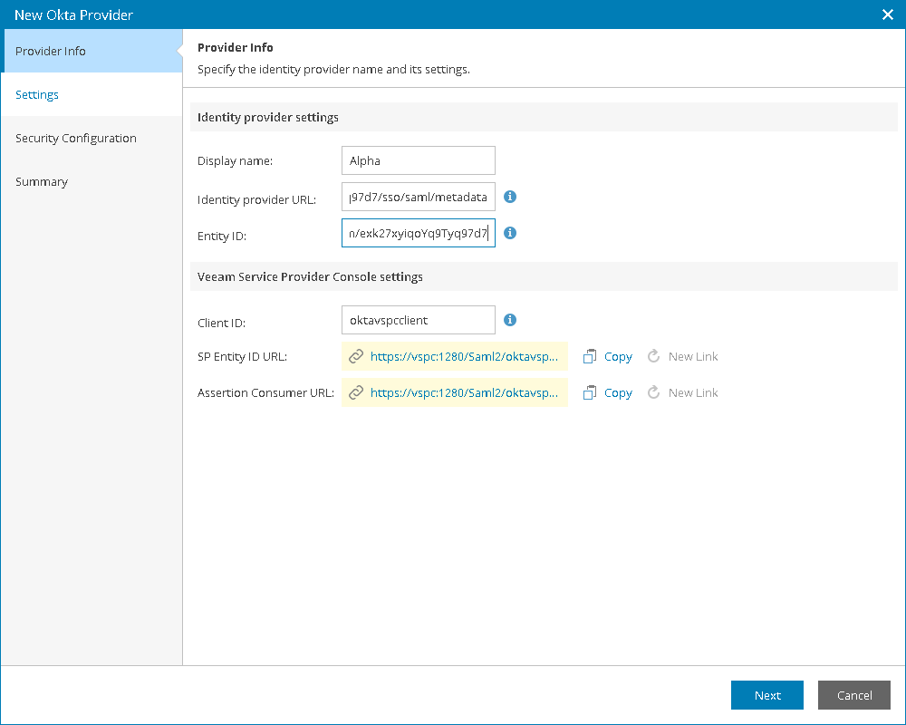 - In Veeam Service Provider Console, insert the URL into the Entity ID field.