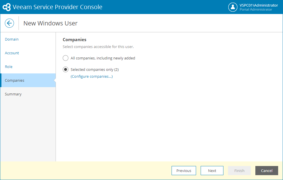 If you want to add a Portal Operator who will manage all companies, select the All companies, including newly added option. With this option selected, Veeam Service Provider Console will also include newly added companies to a Portal Operator management scope.