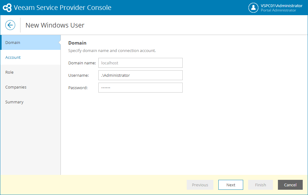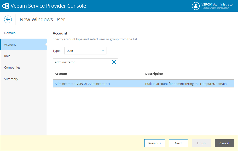 Veeam Service Provider Console will launch the New Windows User wizard.