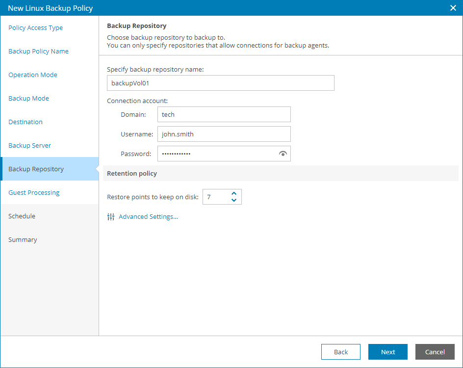 Permissions on the backup repository managed by the target Veeam backup server must be granted beforehand. For details, see section Setting Up User Permissions on Backup Repositories of the Veeam Agent for Linux User Guide.
