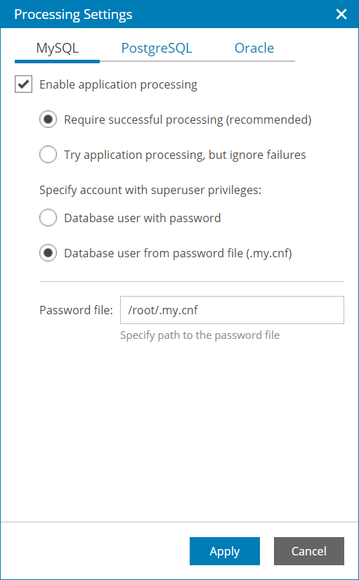 With this option selected, you must specify a path to the password file, but do not need to specify account credentials in the backup job settings. For details about password file configuration, see section Preparing Password File for MySQL Processing of the Veeam Agent for Linux User Guide.