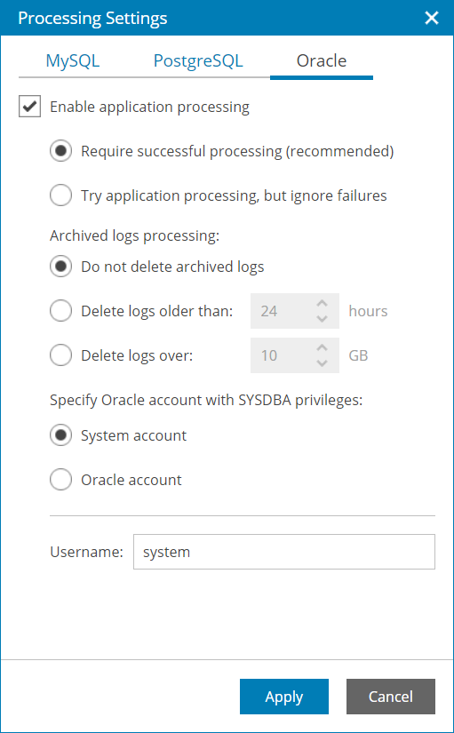 - Require successful processing. With this option selected, Veeam Agent for Linux will stop the backup process if an error occurs when processing the Oracle database system.