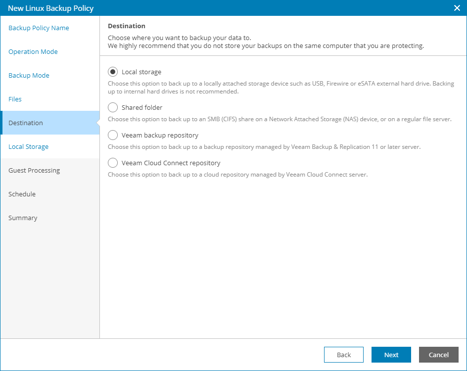 - Local storage — select this option if you want to save the backup on a removable storage device attached to the endpoint, or on a local drive of the endpoint. With this option selected, you will pass to the Local Storage step of the wizard.