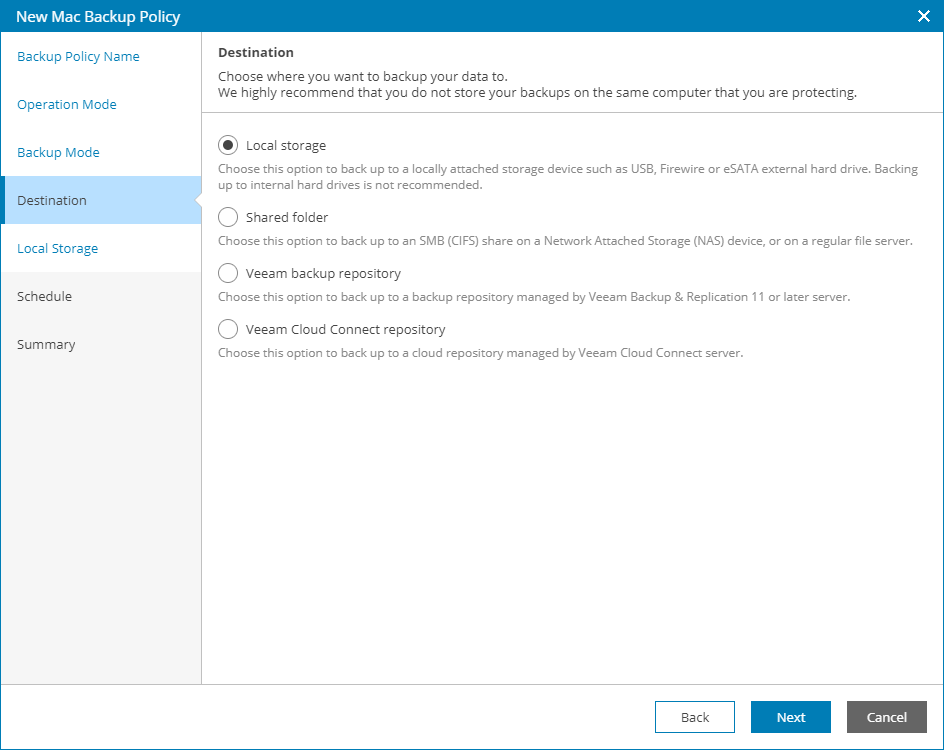 - Local storage — select this option if you want to save the backup on a removable storage device attached to the endpoint, or on a local drive of the endpoint. With this option selected, you will pass to the Local Storage step of the wizard.