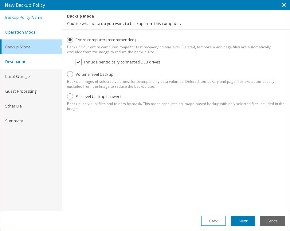 If you want to include in the backup one or more external USB drives, select the Include periodically connected USB drives check box. With this option selected, Veeam backup agent will include in the backup all supported external drives that are connected to the managed computer at the time when the backup job starts. Veeam backup agent supports backup of external drives that support Microsoft VSS: HDD, SSD, and so on. USB flash drives (USB sticks) are not supported. For details, see section Backup of External Drives of the Veeam Agent for Microsoft Windows User Guide.