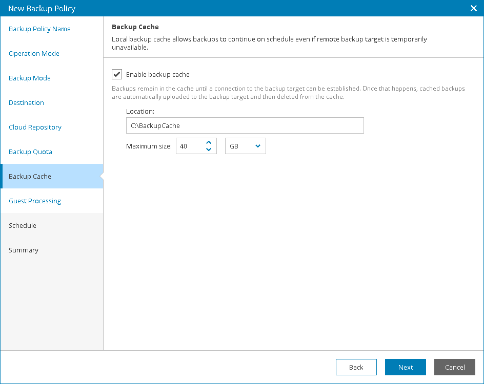 The Backup Cache step of the wizard is available if you have chosen to save backup files on a remote storage: in a network shared folder, on a Veeam Backup & Replication repository or cloud repository.