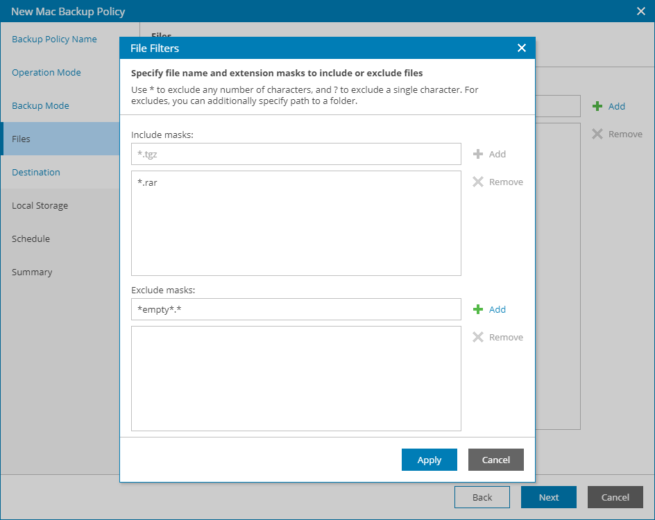 - In the Include masks field, specify file name and/or mask for file types that you want to back up, for example, MyMovie.avi,*filename*, *.docx, *.mp3. Veeam backup agent will create a backup only for selected files. Other files will not be backed up.
