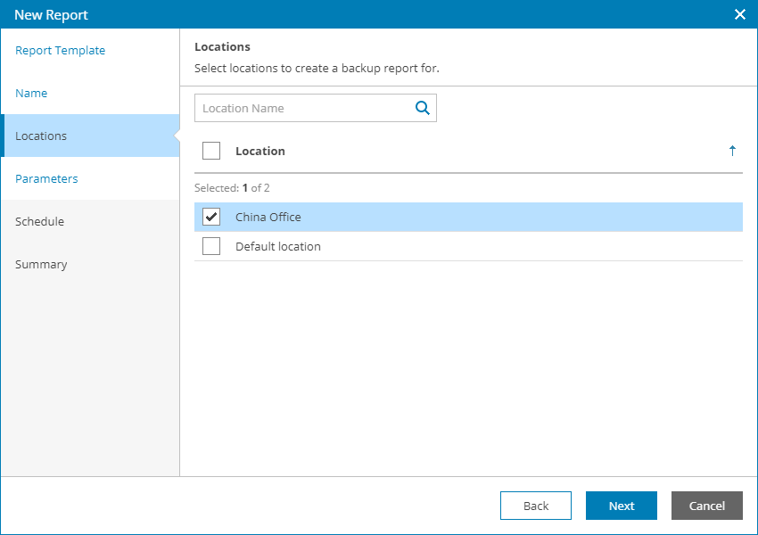 By choosing a location you can limit the scope of the report: only computers, VMs or file shares belonging to the chosen locations will be included in the report.