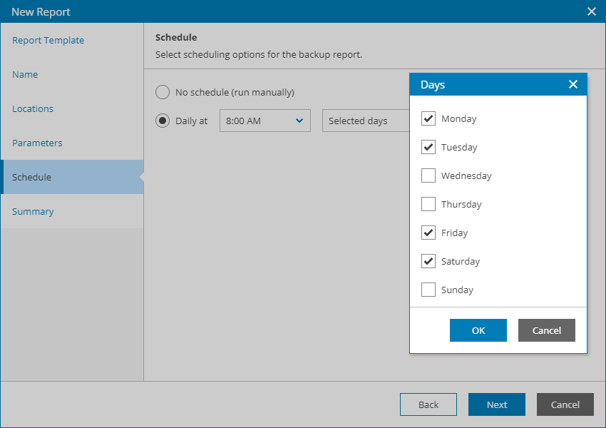 - At the Schedule step of the wizard, specify a schedule according to which the report must be generated: