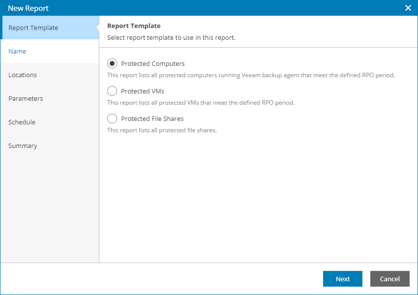 - Protected File Shares — choose this option to create a report that will analyze file share data protection with Veeam Backup & Replication.