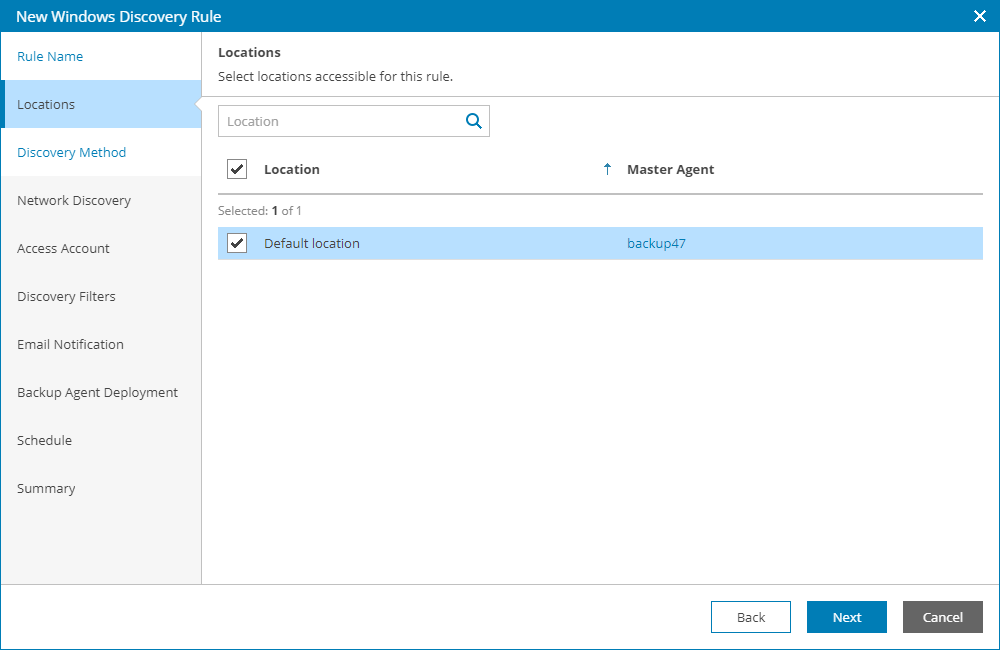 - At the Locations step of the wizard, click a link in the Master Agent column and select a management agent that will be used as the master agent for discovery in each company location.