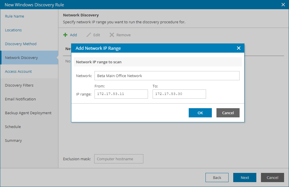 - At the Network Discovery step of the wizard, specify one or more networks and IP ranges that must be scanned to discover computers: