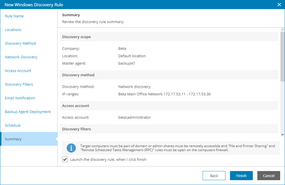 - To start discovery after you save the rule, select the Launch the discovery rule when I click Finish check box.