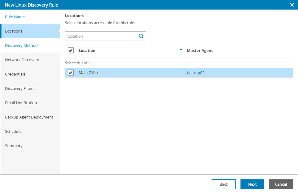By default, discovery is performed in all company locations where you deployed a master agent. If you choose to perform discovery in multiple locations, after you complete the wizard steps, Veeam Service Provider Console will create a separate discovery rule for each location. If you do not want to perform discovery in some company locations, clear check boxes next to these locations.