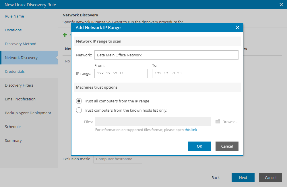 - Select the Trust all computers from the IP range option, to discover all computers in the specified IP range.