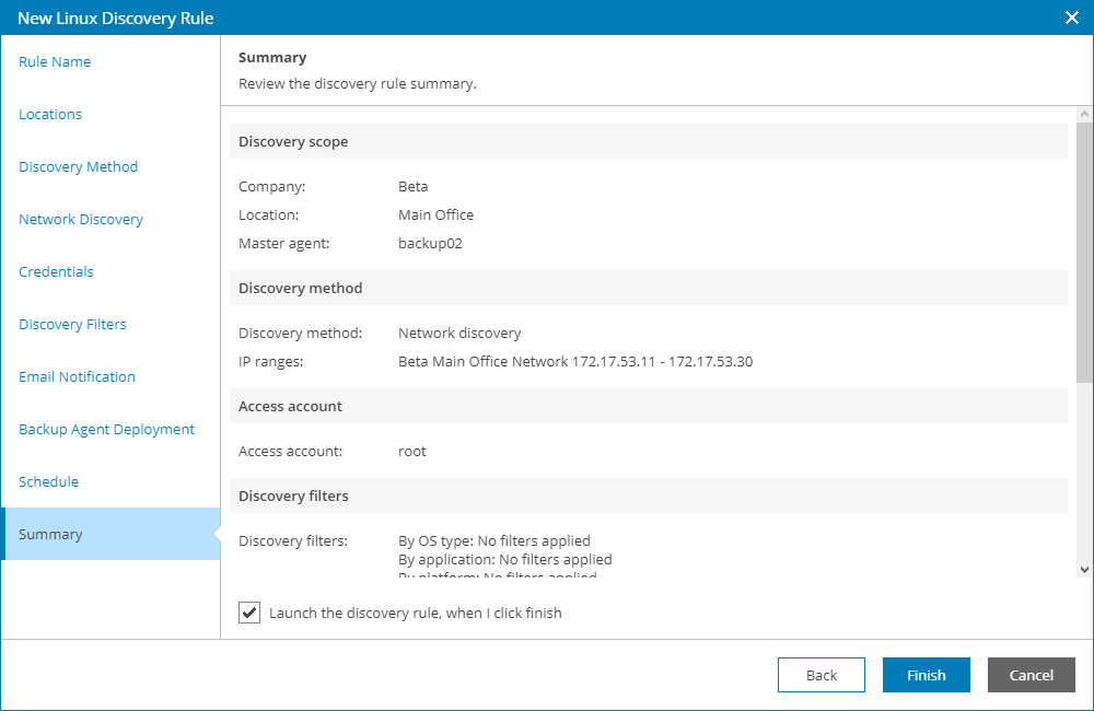 - To start discovery after you save the rule, select the Launch the discovery rule when I click Finish check box.