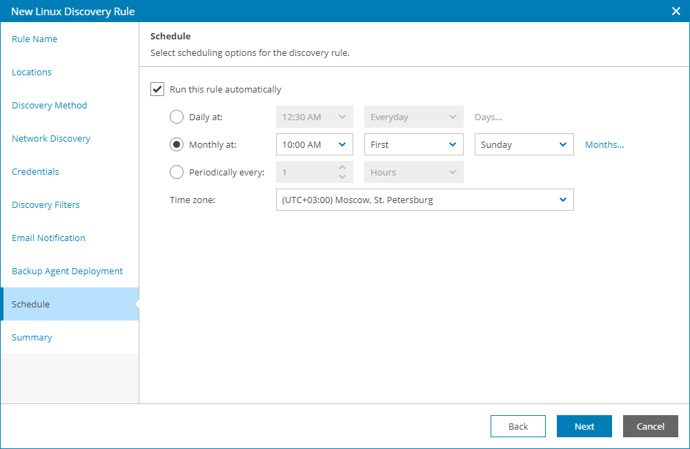 - At the Schedule step of the wizard, specify schedule according to which discovery must be performed: