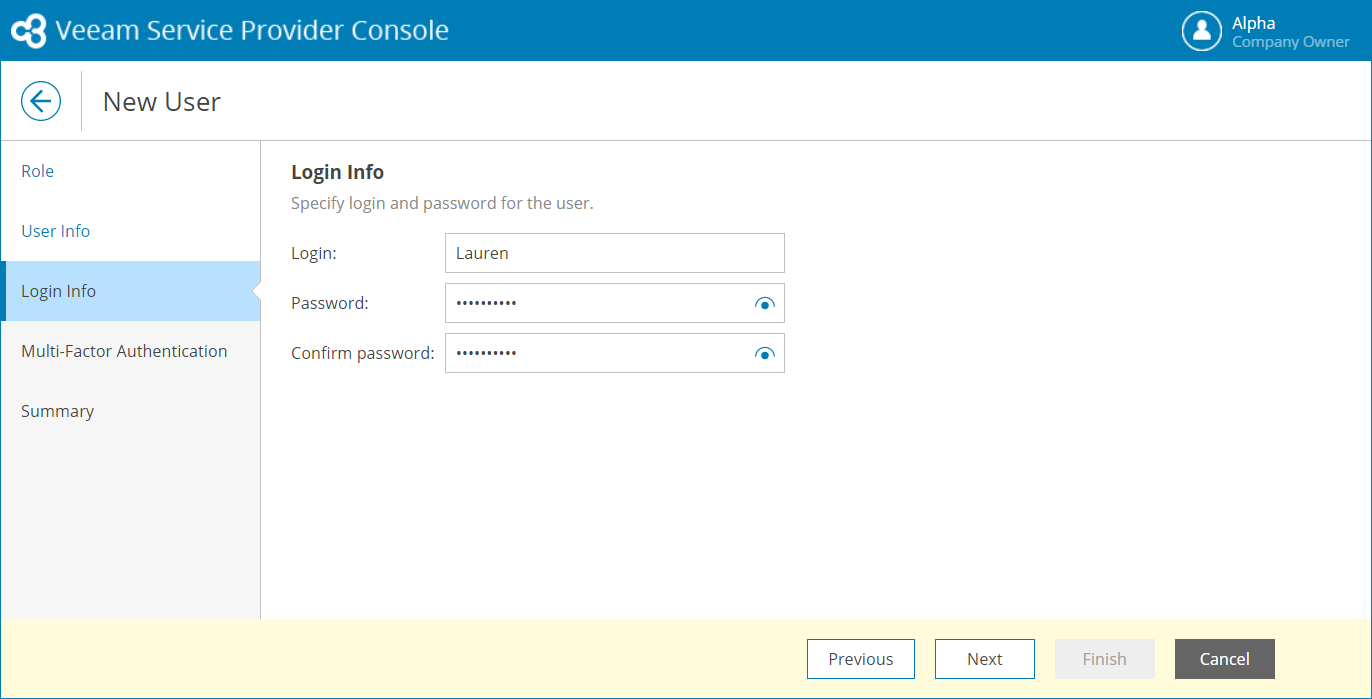 - At the Login Info step of the wizard, in the Username, Password and Confirm Password fields, type a user name and password.