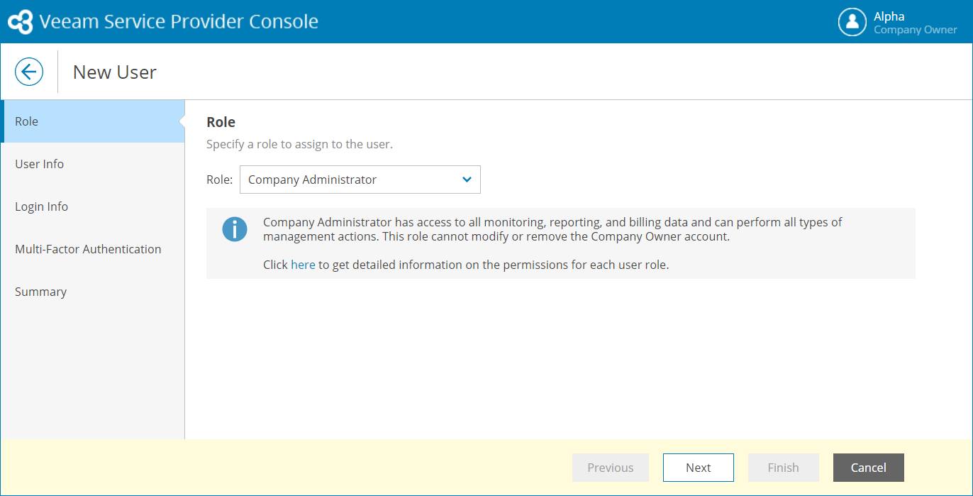 - At the Role step of the wizard, in the Role field, choose Company Administrator.