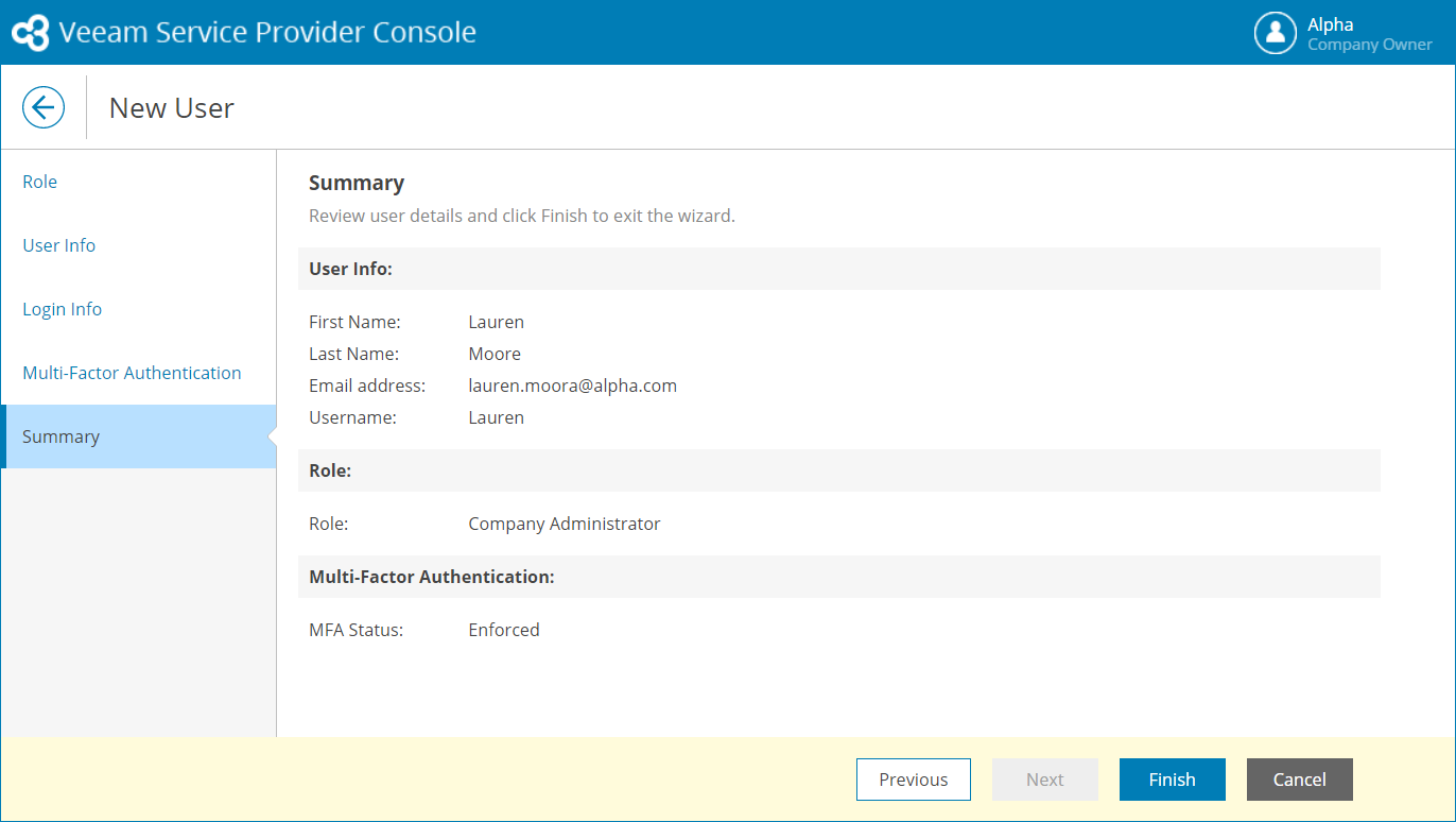 - At the Multi-Factor Authentication step of the wizard you can assign a second authentication factor to the new user. For details on MFA, see Configuring Multi-Factor Authentication.