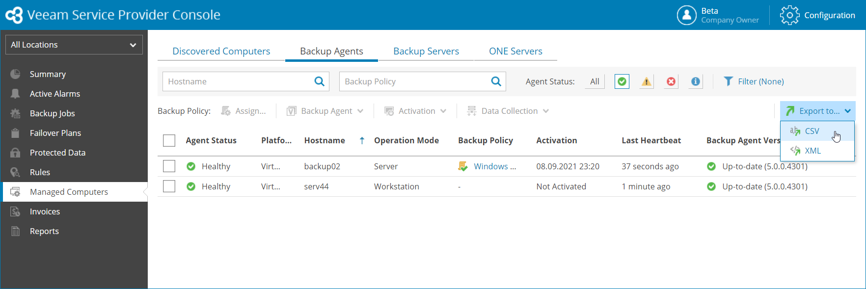 You can view details on managed Veeam backup agents and export them to a CSV or XML file.