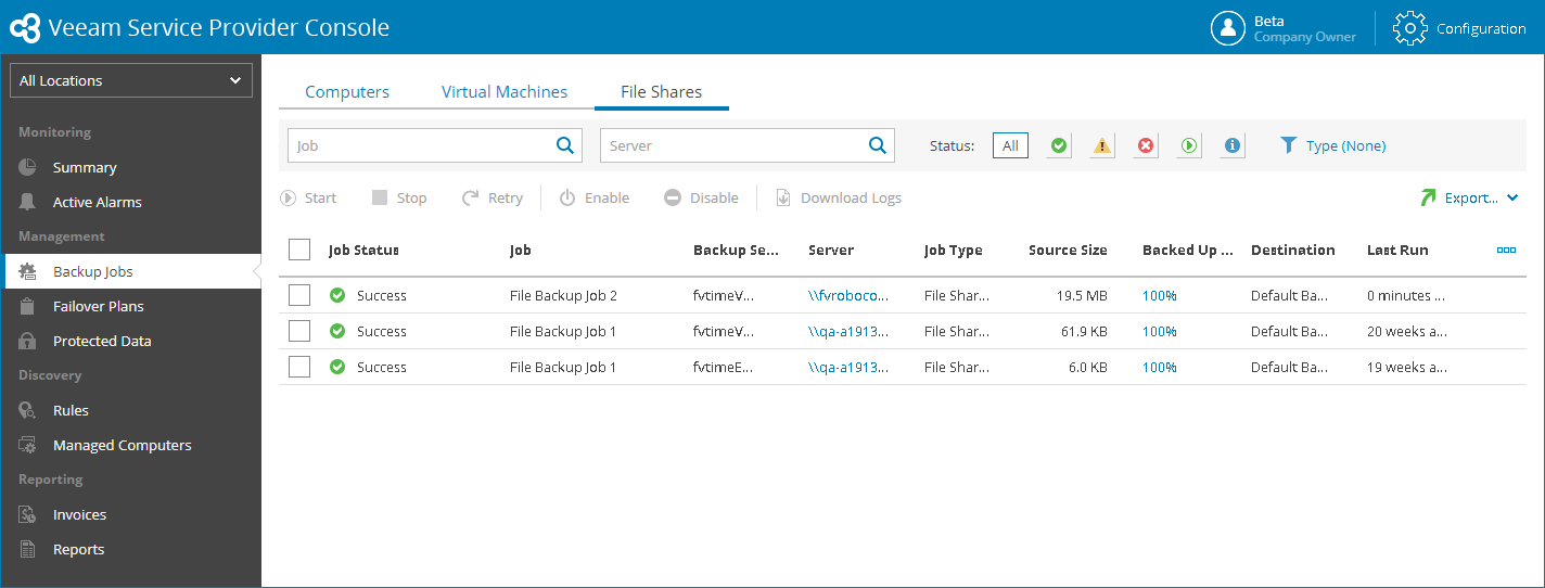 Veeam Service Provider Console will display a list of all file jobs configured on managed backup servers.