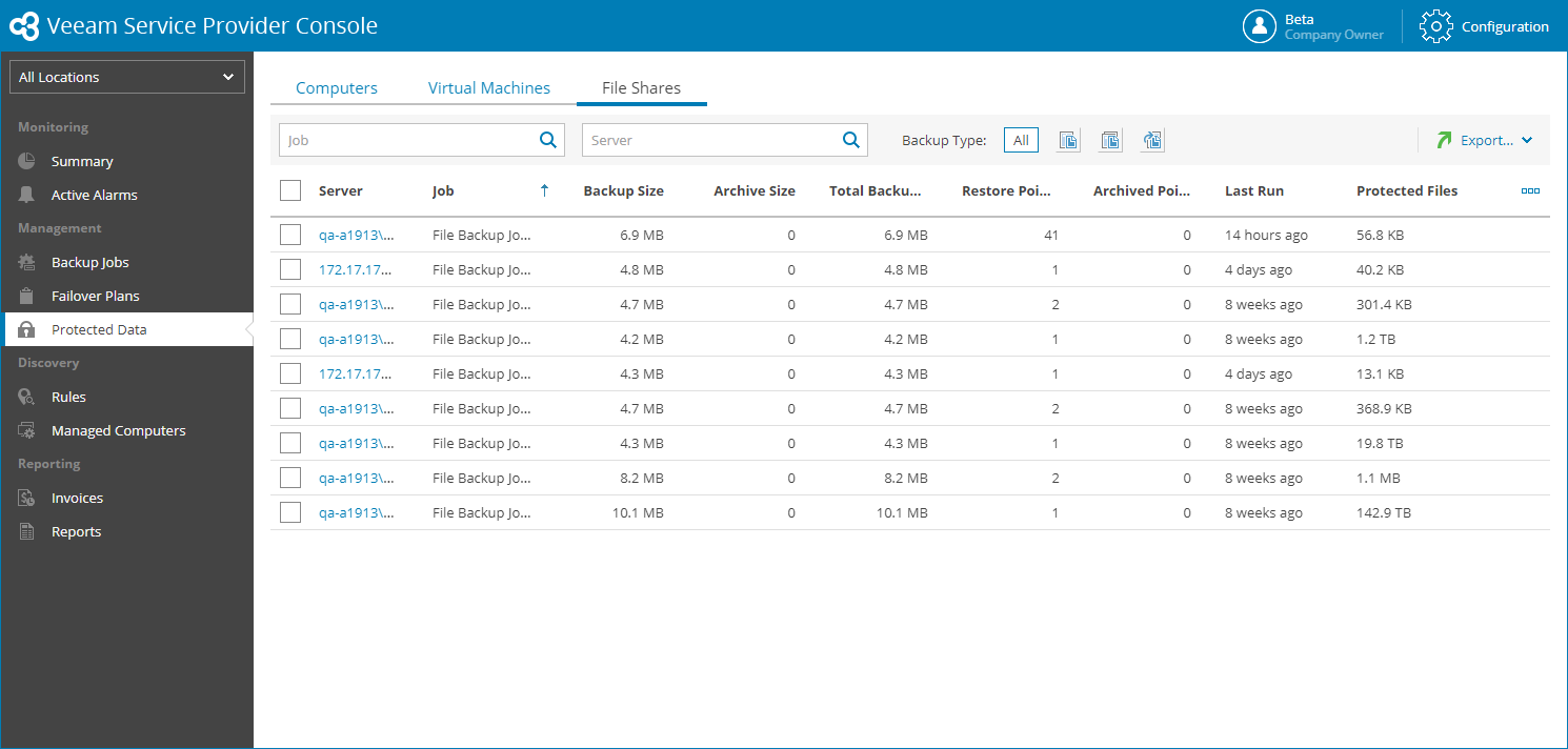 Veeam Service Provider Console will display a list of all file share servers protected by Veeam Backup & Replication.
