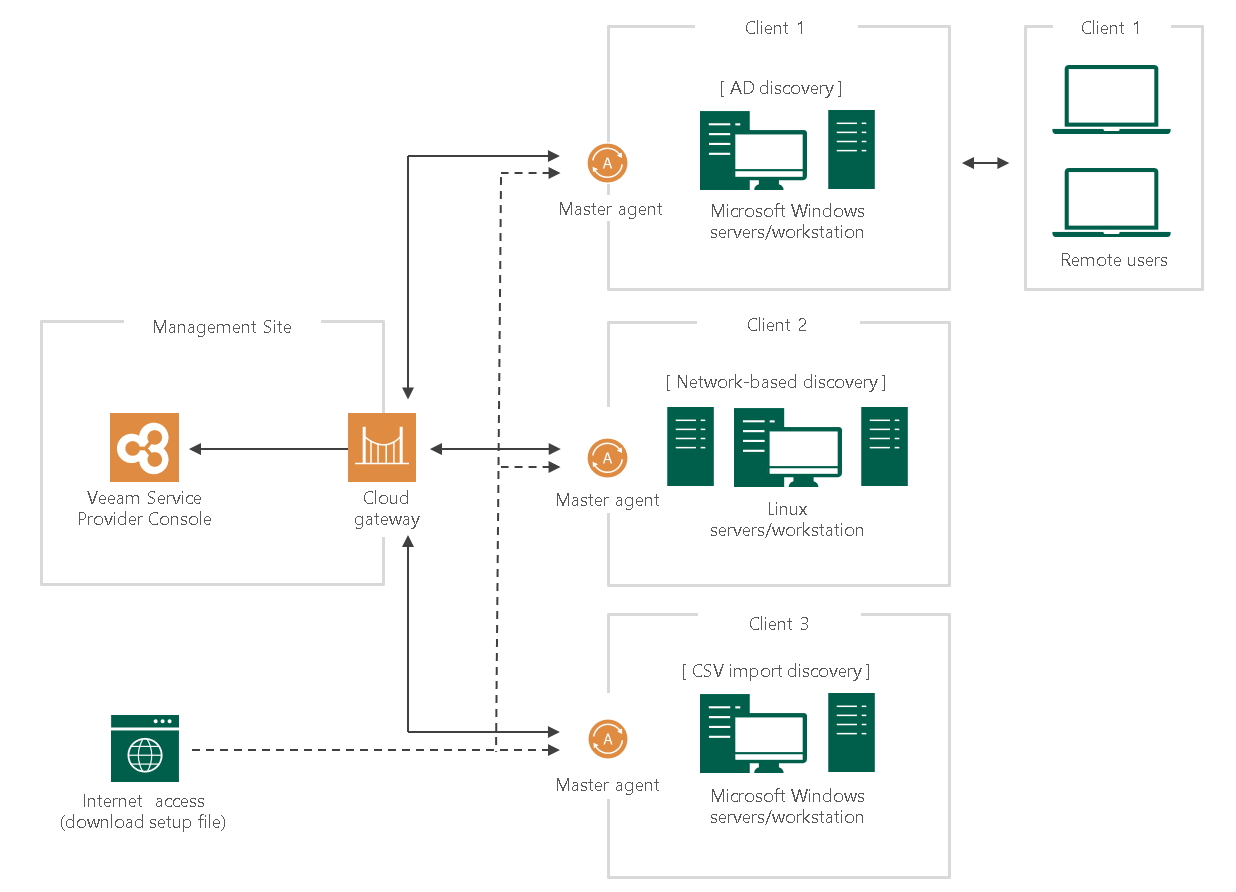 For installation with discovery rules, Veeam Service Provider Console requires a master agent. A master agent is a Veeam Service Provider Console management agent that runs on a Windows or Linux machine in the managed infrastructure. This agent is responsible for performing various types of tasks during the discovery and installation procedures, such as collecting information about discovered computers, installing Veeam Service Provider Console management agents on managed computers, downloading the Veeam backup agent setup file, uploading it to managed computers, and so on.