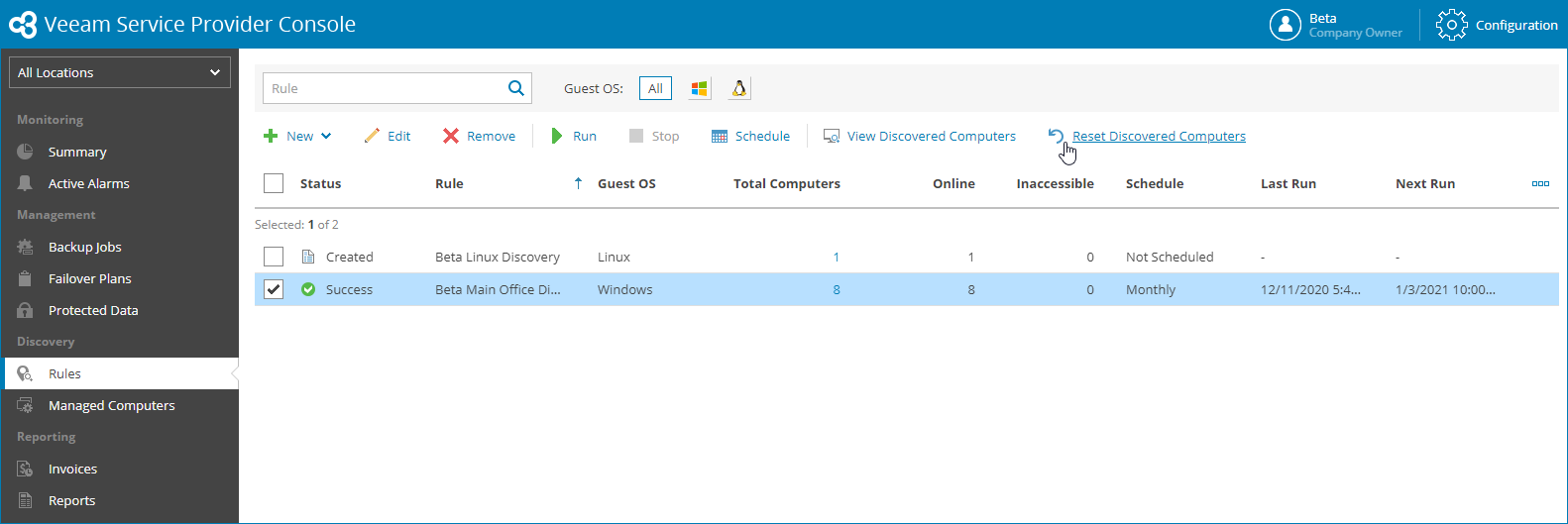 When you perform reset for a discovery rule, computers discovered with this rule are removed from the discovered computers list. However, computers on which Veeam Service Provider Console management agents are already installed and configured to communicate with Veeam Service Provider Console will be moved to the list of computers discovered by the External Discovery rule.