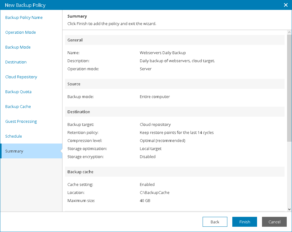 This is an archive version of the document. To get the most up-to-date information, see the current version. Step 18. Review Backup Policy Settings At the Summary step of the wizard, review settings of the configured backup policy and click Finish.