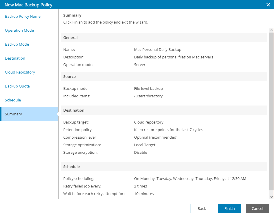 This is an archive version of the document. To get the most up-to-date information, see the current version. Step 15. Review Backup Job Settings At the Summary step of the wizard, review settings of the configured backup policy and click Finish.
