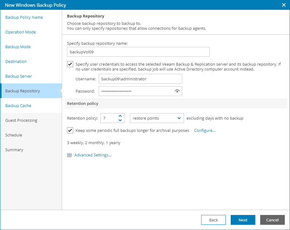 Specify settings for the target backup repository: