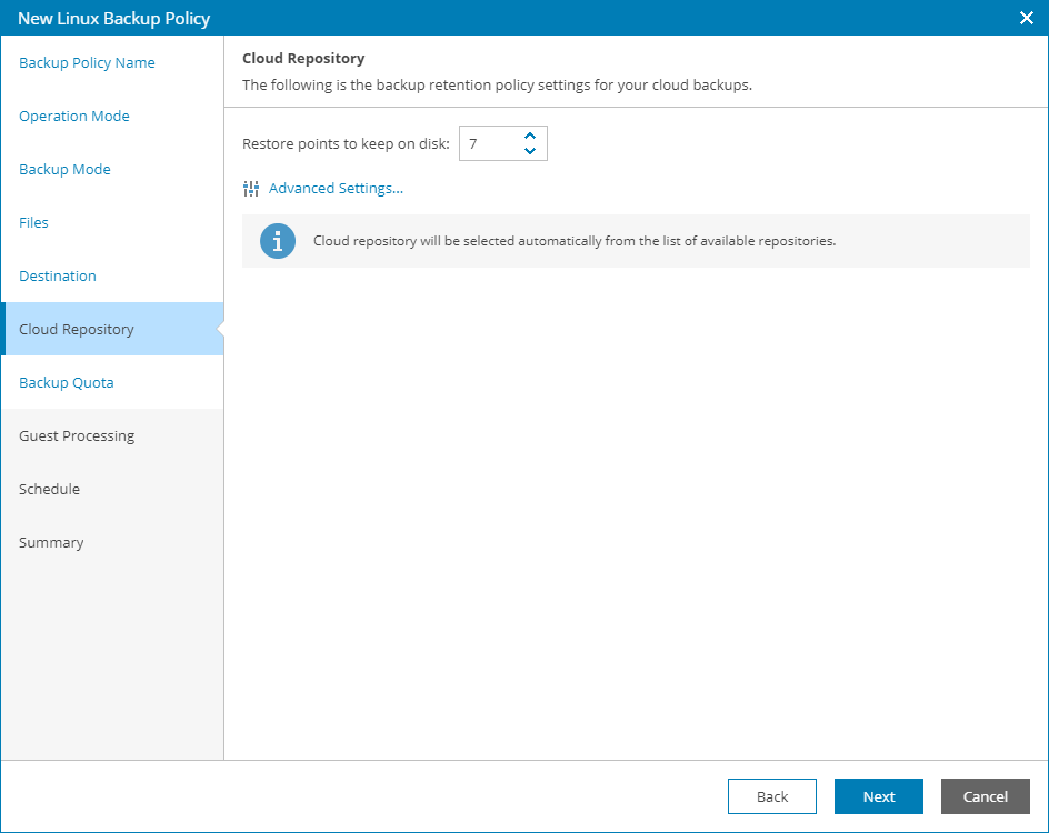 The cloud repository on which backups will be stored will be selected automatically. If you want to store backups on a specific backup repository, you can choose this repository in backup job settings for specific computers. For details, see Configuring Backup Job Settings for Individual Computers. |