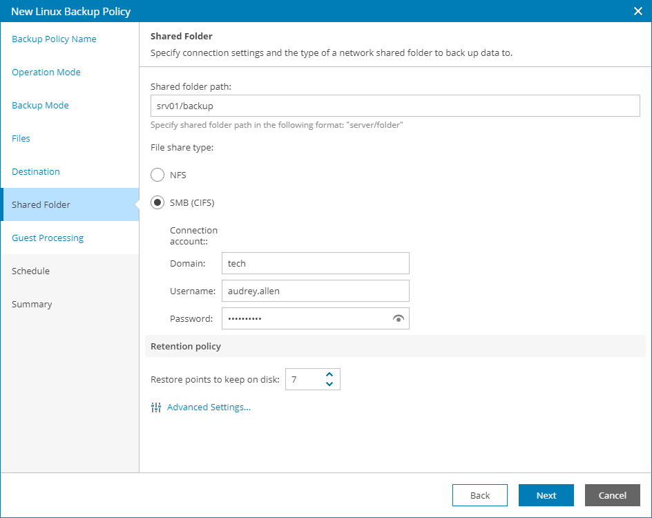 The Shared Folder step of the wizard is available if at the Destination step you have chosen to save the backup in a network shared folder.
