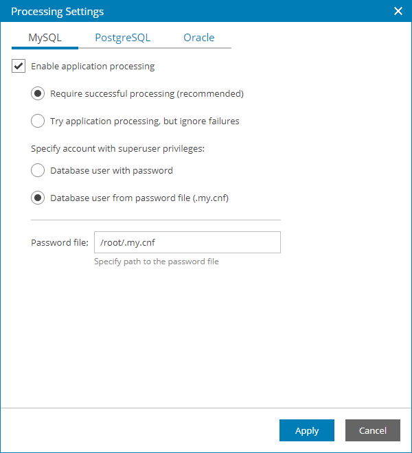 With this option selected, you must specify a path to the password file, but do not need to specify account credentials in the backup job settings. For details about password file configuration, see section Preparing Password File for MySQL Processing of the Veeam Agent for Linux User Guide.