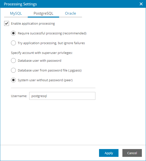 - Require successful processing. With this option selected, Veeam Agent for Linux will stop the backup process if an error occurs when processing the PostgreSQL database system.