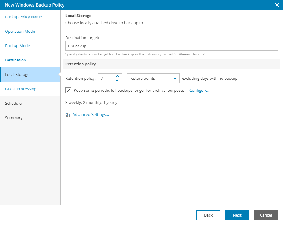 The Local Storage step of the wizard is available if at the Destination step you have chosen to save the backup on a local drive of the computer.