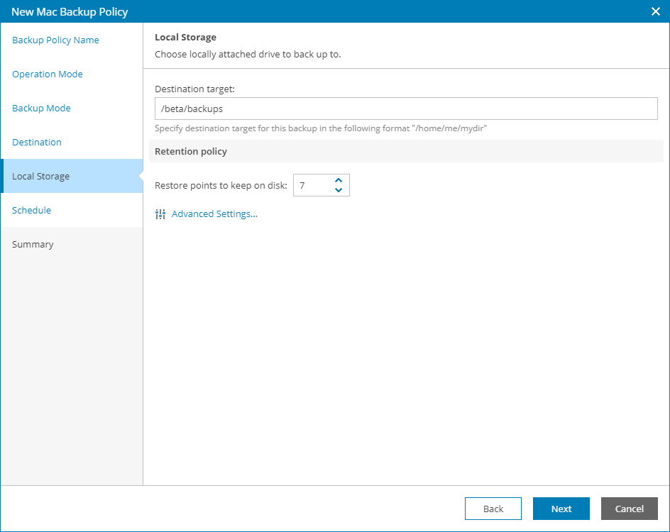 The Local Storage step of the wizard is available if at the Destination step you have chosen to save the backup on a local drive of the computer.