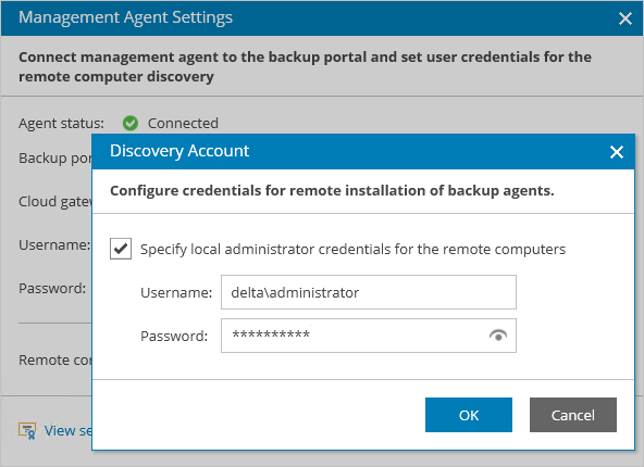 - In the Veeam Management Agent Settings window, click the Remote computer discovery user account link.