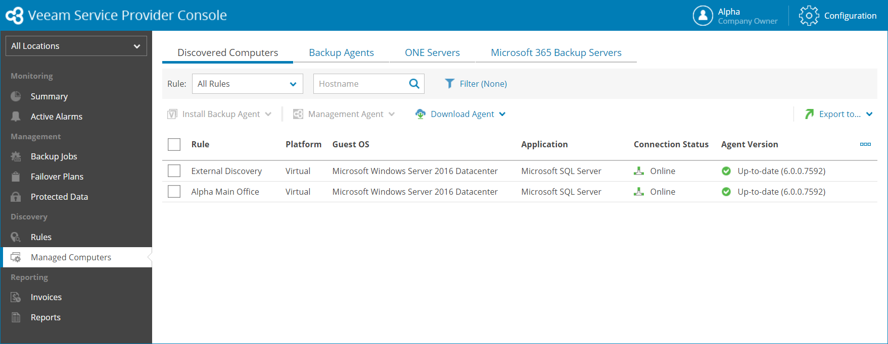 - Agent Version — version of a Veeam Service Provider Console management agent (Up-to-date, N/A, Not installed, Out-of-date, Patch available).