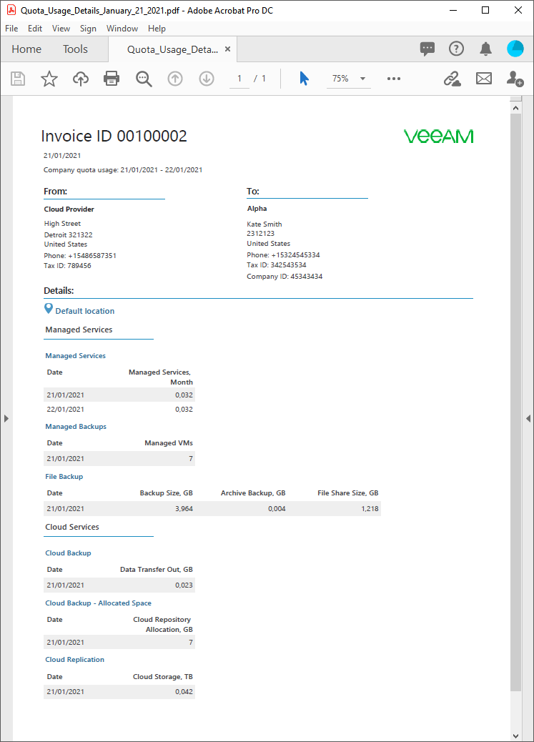 - Details — information about services consumed by each company location on each day of the quota usage period.